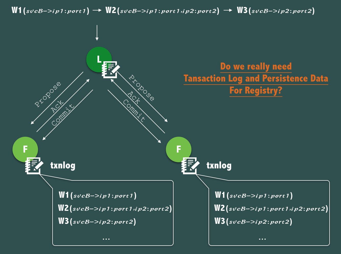 但是仔细分析,通过事务日志,持久化连续记录这个变化过程其实意义不大,因为在服务发现中,服务调用发起方更关注的是其要调用的服务的实时的地址列表和实时健康状态,每次发起调用时,并不关心要调用的服务的历史服务地址列表、过去的健康状态。