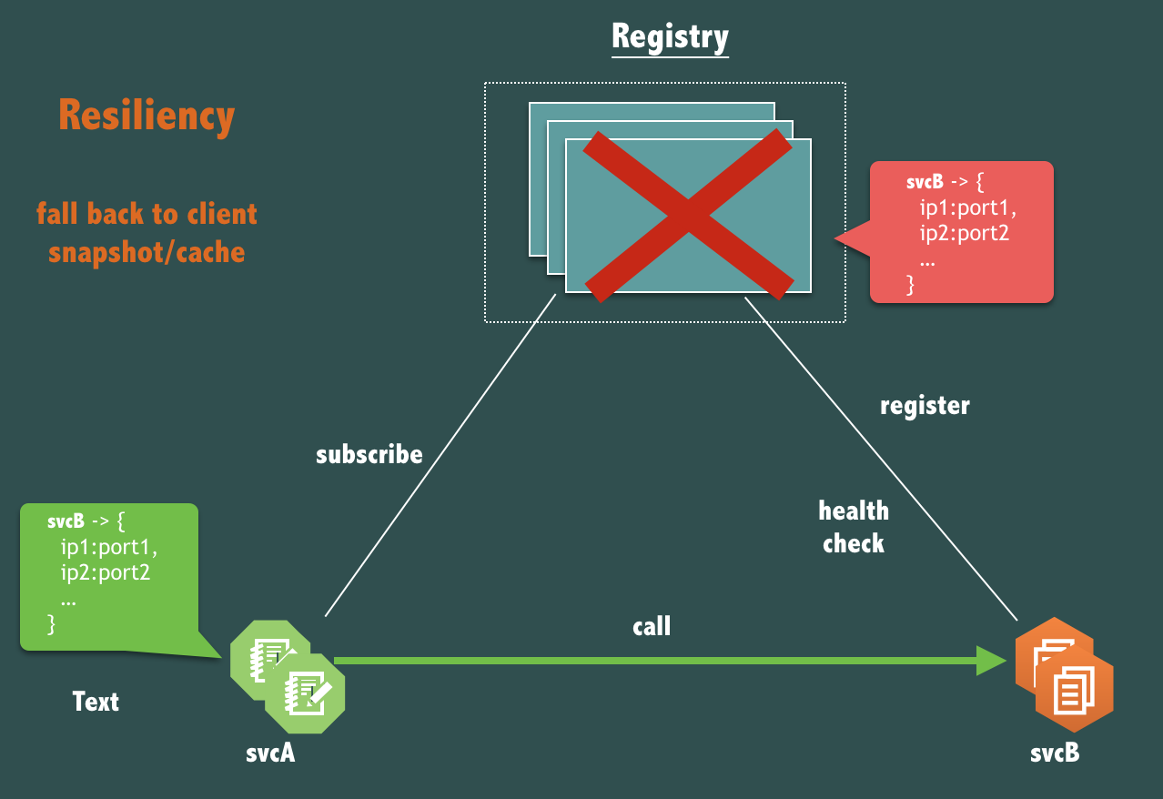 前文提过,在实践中,注册中心不能因为自身的任何原因破坏服务之间本身的可连通性,那么在可用性上,一个本质的问题,如果注册中心(Registry)本身完全宕机了,svcA 调用 svcB链路应该受到影响么?