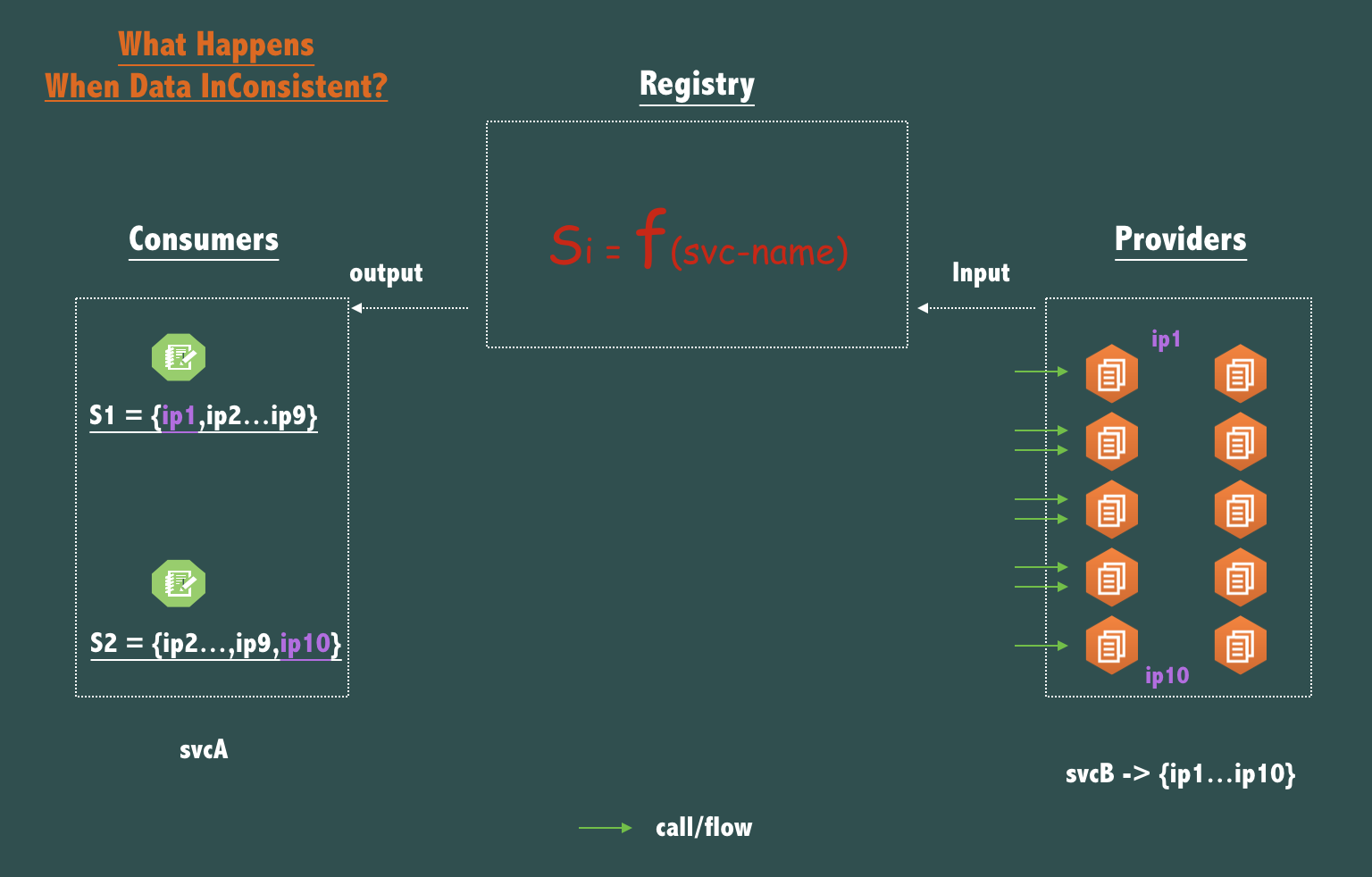 如上图所示,如果一个 svcB 部署了10个节点 (副本/Replica),如果对于同一个服务名 svcB, 调用者 svcA 的2个节点的2次查询返回了不一致的数据,例如: S1 = { ip1,ip2,ip3…,ip9 }, S2 = { ip2,ip3,….ip10 }, 那么这次不一致带来的影响是什么?