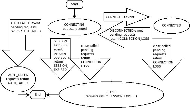 ZooKeeper 的原生客户端绝对称不上好用,Curator 会好一点,但其实也好的有限,要完全理解 ZooKeeper 客户端与 Server 之间的交互协议也并不简单,完全理解并掌握 ZooKeeper Client/Session 的状态机(下图)也并不是那么简单明了: